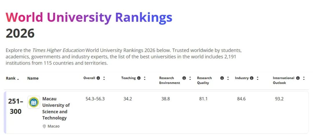2026泰晤士排名发布 澳科大研究创新与产业转化能力跃升 英国《泰晤士高等教育》(Times Higher Education,THE)于2025年10月9日公布2026年度世界大学排名(World Universit... 2025/10/10